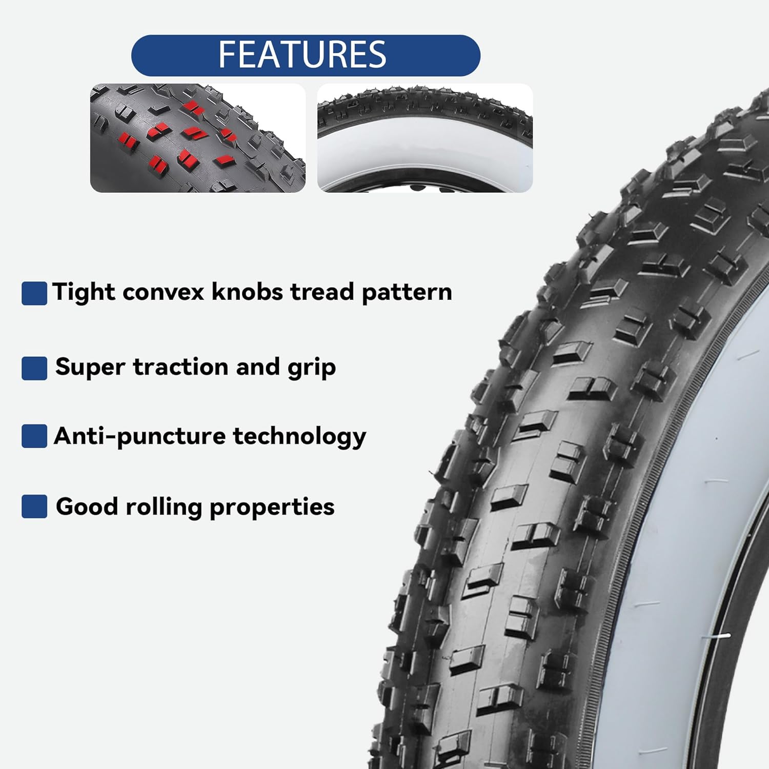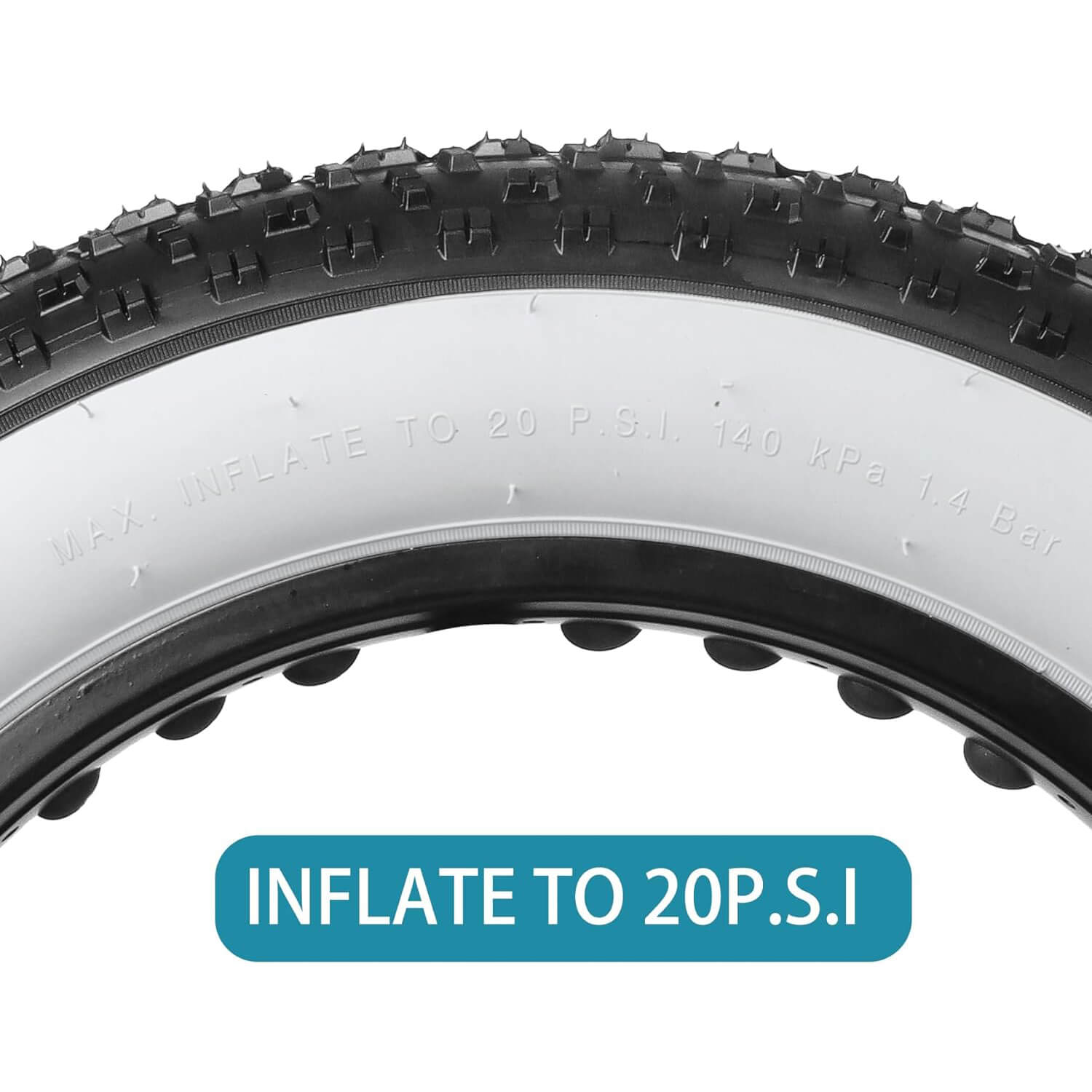 Raider (White-side version) aggressive fat tires are for electric, snow, and mountain fat bikes. With an aggressive tread pattern and comprehensive tire volume, these tires provide a balance of grip and rolling resistance for a smooth ride on various terrains. The white-wall tire is also a stylish decoration for fat bikes.