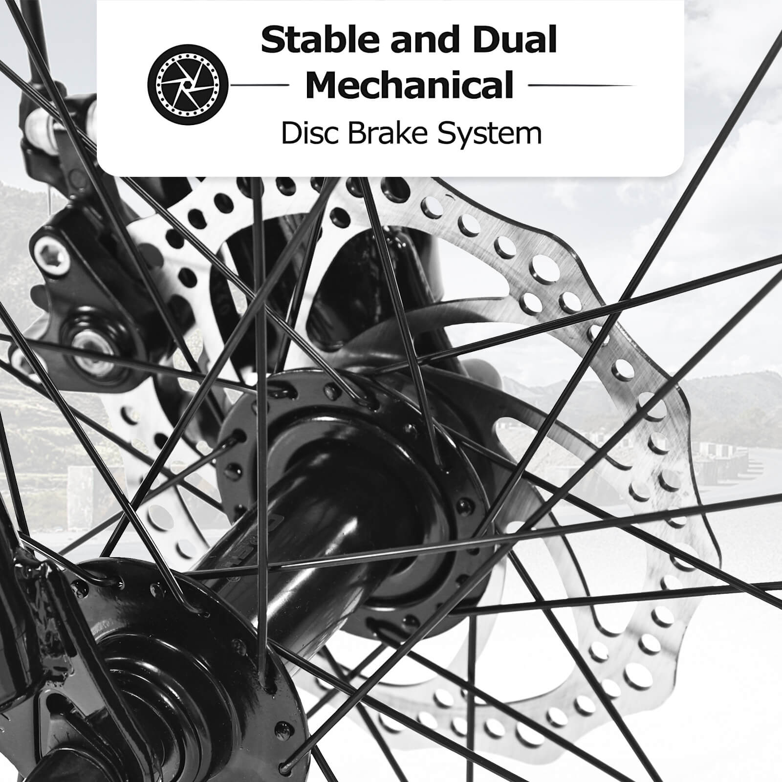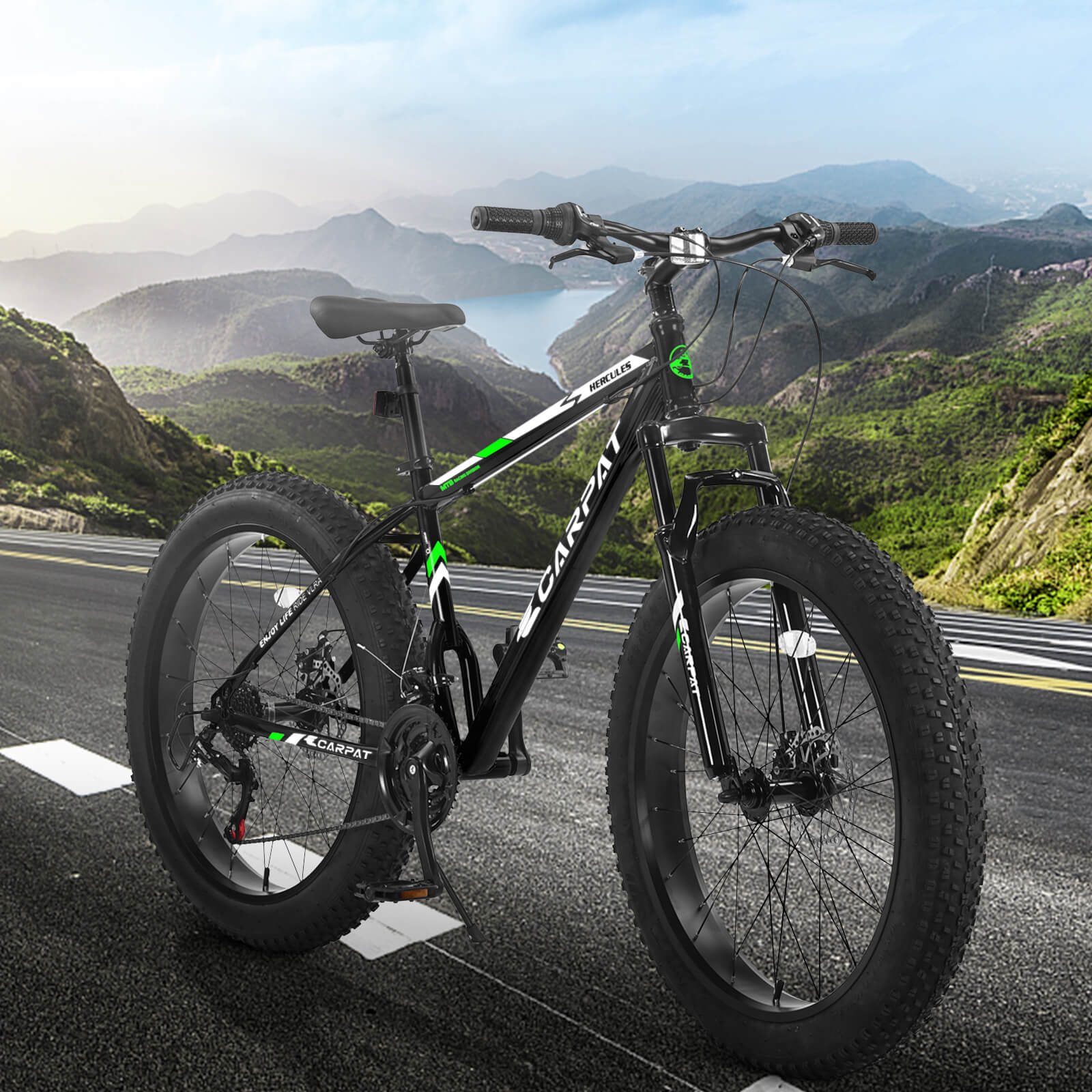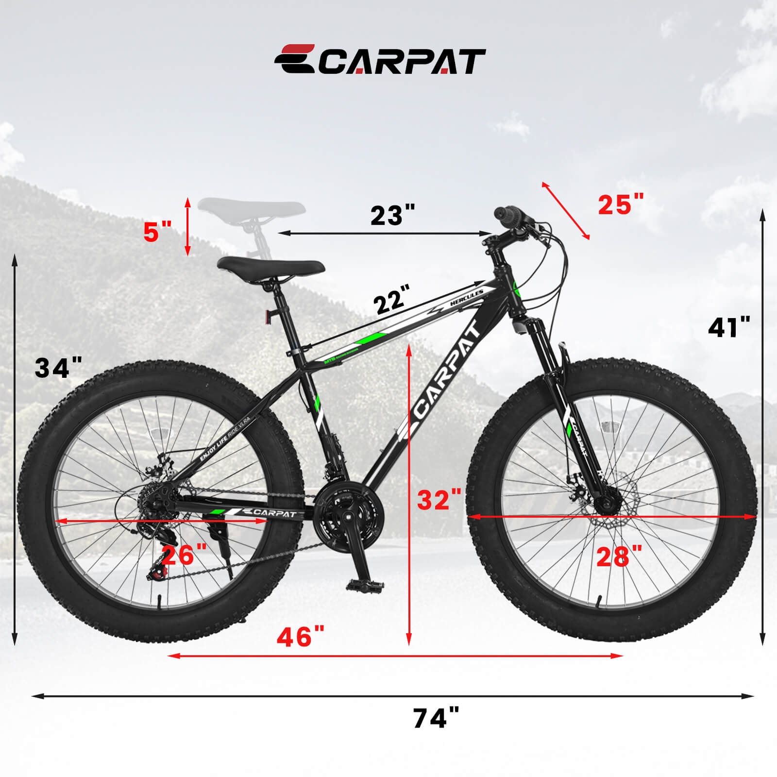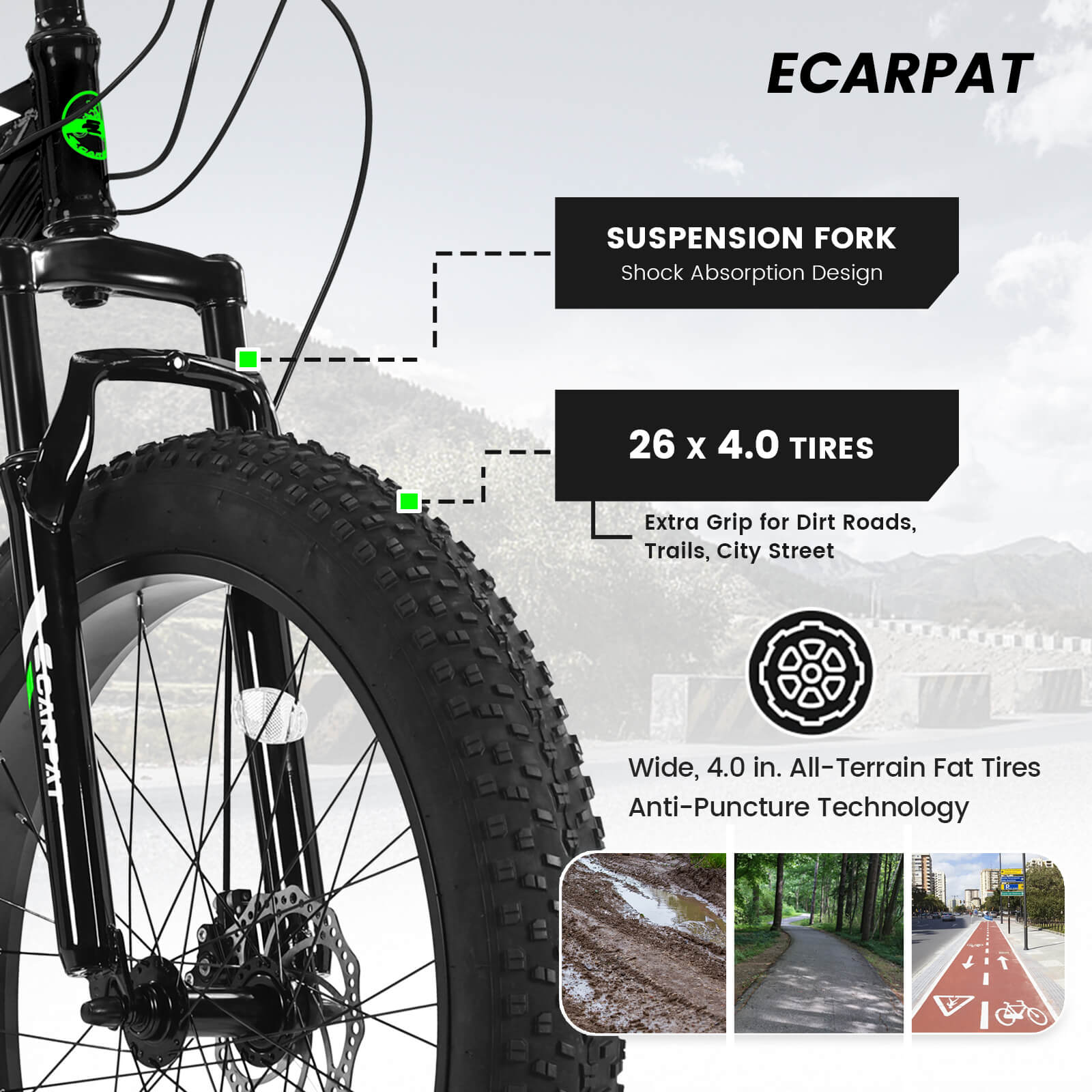 Ecarpat Elecony 26"×4" Fat Tire Bike is engineered for versatility and comfort. Its high-carbon steel frame and 100mm front suspension fork absorb shocks, ensuring a smooth ride on rough terrains. The 26×4.0" wide tires offer exceptional grip and stability, making it ideal for trails, beaches, snow, and city streets. With a 7-speed drivetrain and dual disc brakes, this bike provides precise control and reliable stopping power. Arriving 85% pre-assembled, it's ready for adventure with minimal setup.