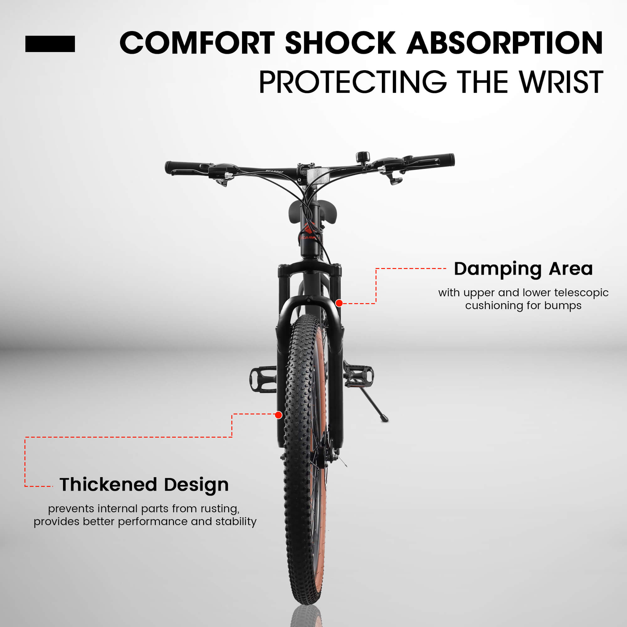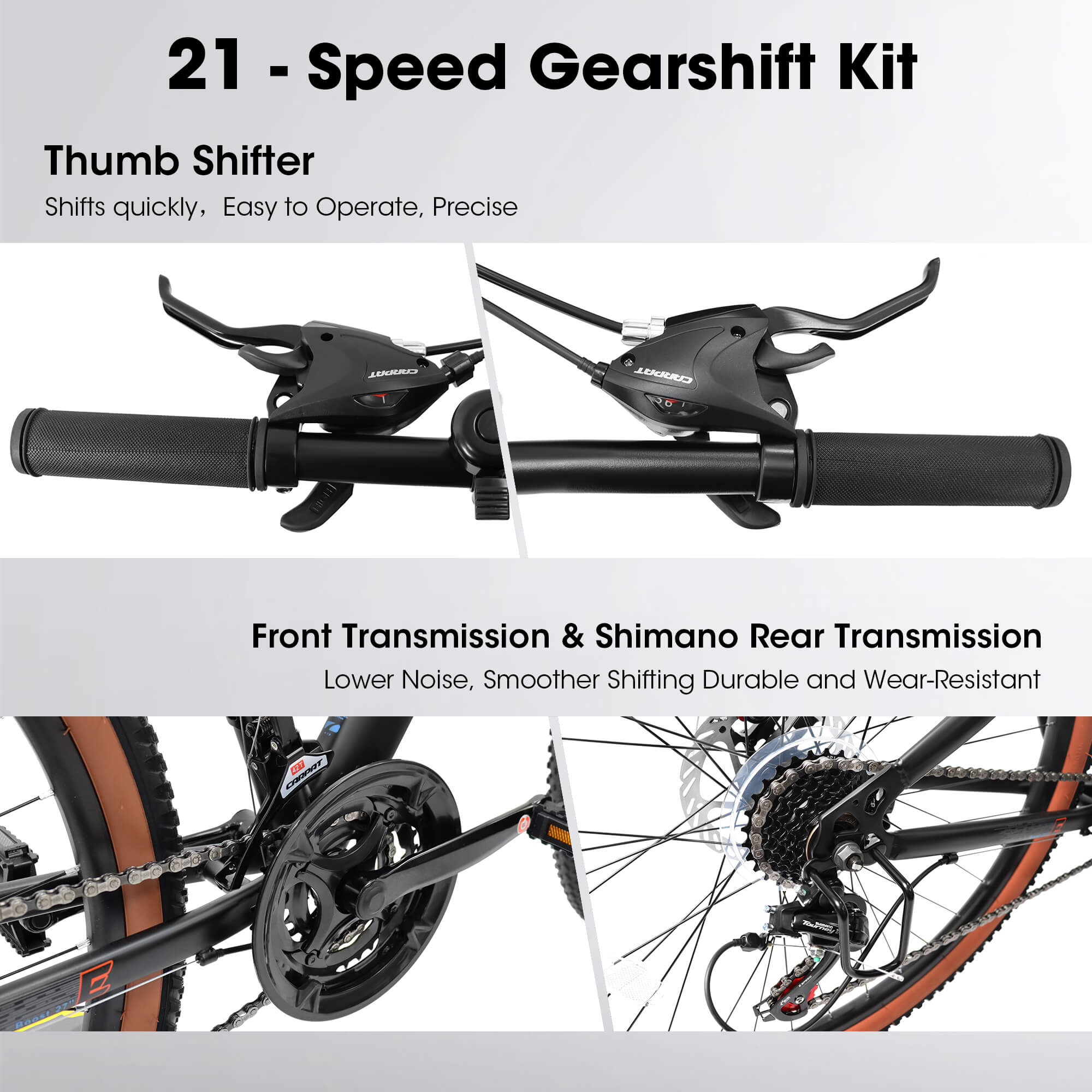 Durable Steel Frame: 24x16 inch sturdy and durable steel frame, provides safe and stable cycling experience. Ergonomically designed, suitable for men womens height 4'2"-4'9", max weight is up to 250lbs.21-Speed with Disc Brakes: Twist shifters help switch gears with smoothness. Simple operation allows for a quick selection of gears for various terrains. Mechanical dual disc brake system, simple structure and convenient for maintenance.Front Fork Shock Absorber: Feature 100mm front suspension fork. The thickened fork helps resist and absorb shocks. The parallel bars can adapt to pressure road conditions. Greatly improve the comfort during riding and allows you to enjoy riding.24x2.125" All-Terrain Tires: Made of high-quality rubber, all-terrain tires with strong puncture resistance soften the bumps and stick to the Dirt, Trail, Gravel, Paved Path for a smooth, stable ride: strong grip, have a super excellent anti-skid function and is not easy to slip.85% Pre-Assembled: The bike comes 85% pre-assembled. Just need to assemble the handlebar, saddle, front wheel and pedals.