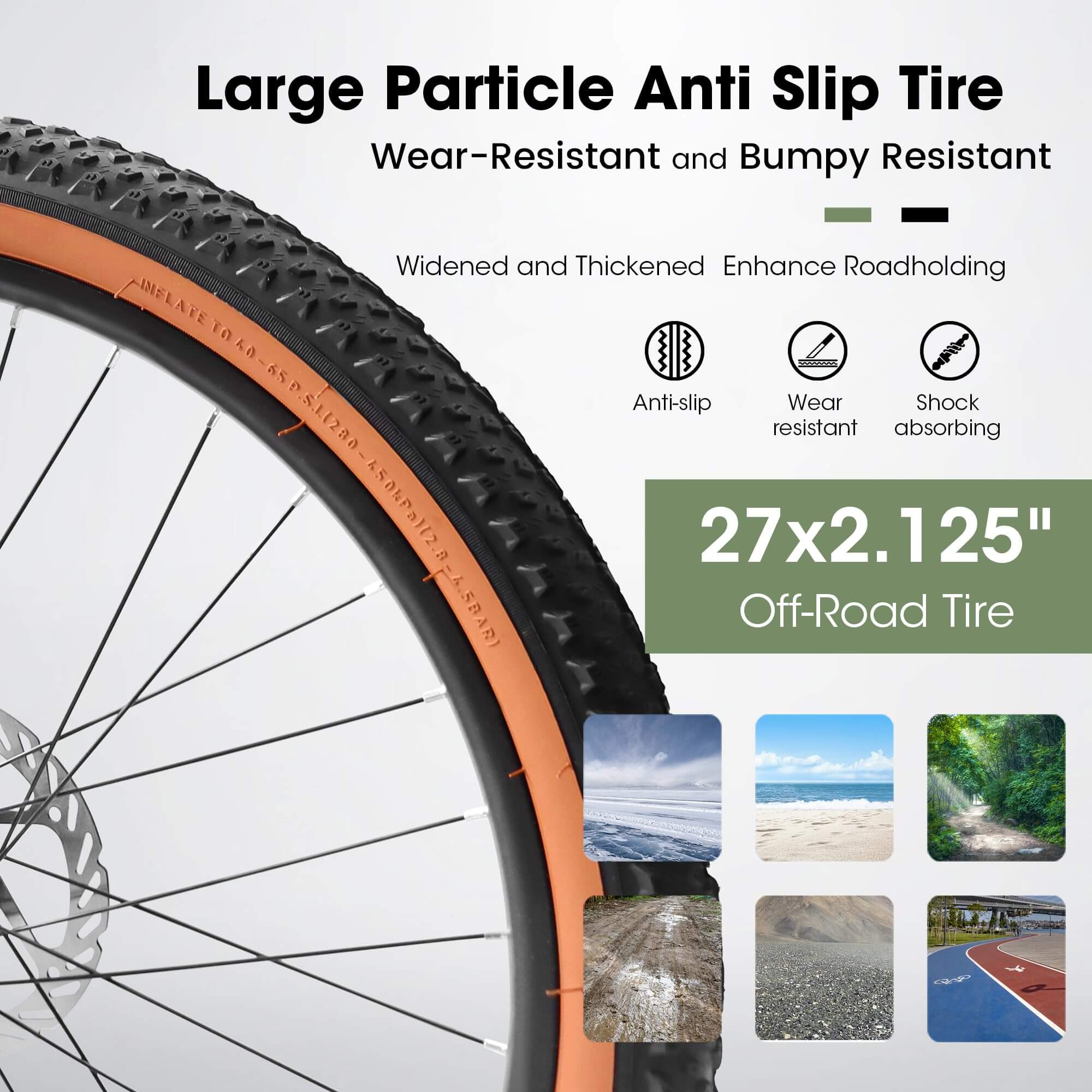 Made of high-quality rubber, all-terrain tires with strong puncture resistance soften the bumps and stick to the Dirt, Trail, Gravel, Paved Path for a smooth, stable ride: strong grip, have super excellent anti-skid function and not easy to slip.