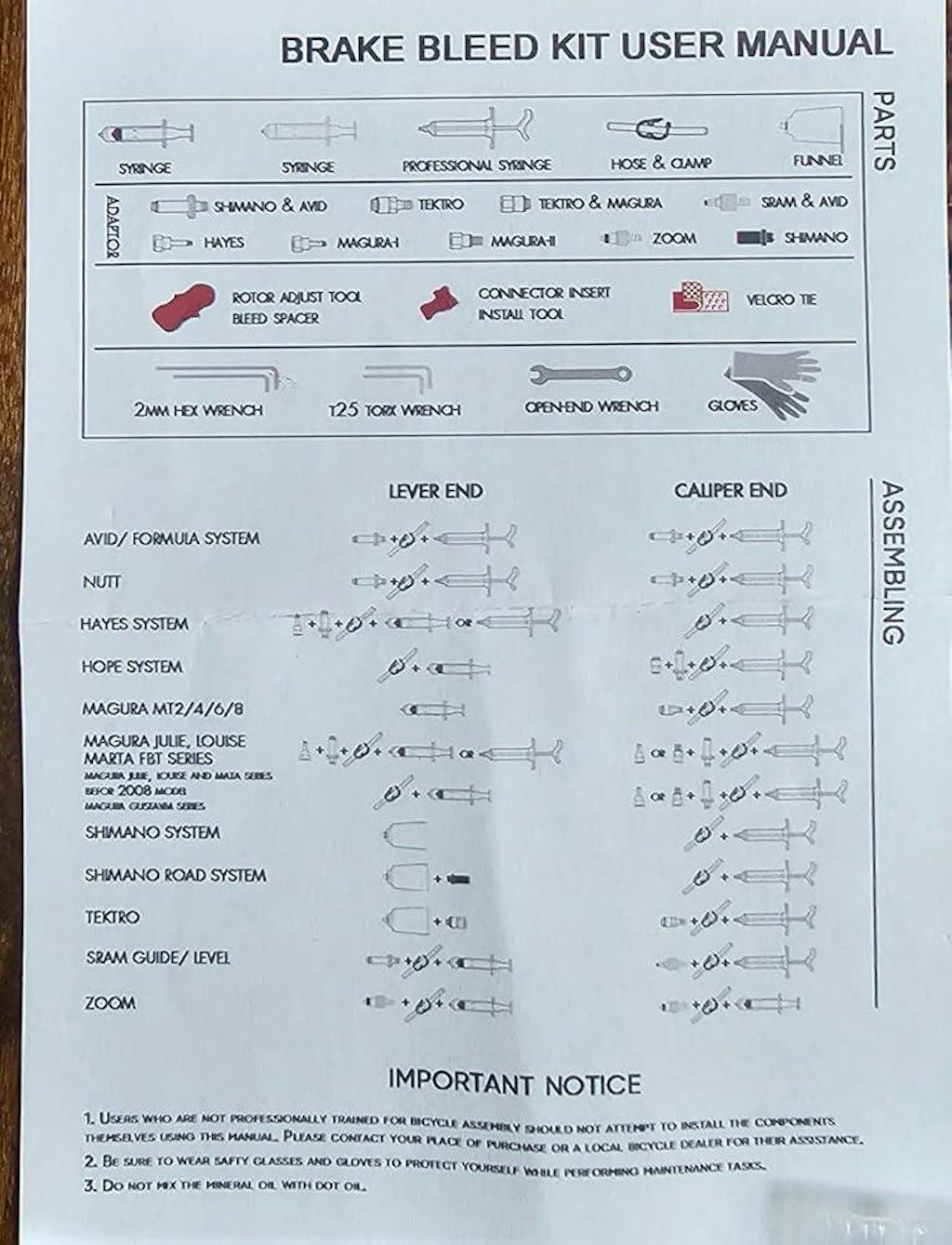 Overall, this is a brake bleed kit that gets the job done at the end of the day. It's easy enough to use even if you're relatively new or don't know how to bleed your brakes. It only comes with a sheet showing kit contents and adapter setups for various types of brakes. One plus is that it arrived sealed with no leakage of brake fluid, however it claims to have a Torx wrench but I don't have one in my kit, as others have also mentioned. Also, as others have noted it only comes with a 100 ml bottle, however this is more than plenty to bleed both front and rear hydraulic lines. One downside is that it doesn't have any type of instructions, however a quick search can yield multiple videos on how to easily bleed brakes. It does have instructions on the landing page. Overall, not a bad kit, but there are others on the market in the same price range that you can get more out of. At the end of the day, it gets the job done, and I have a fully functioning bike with brakes that I can rely on again.