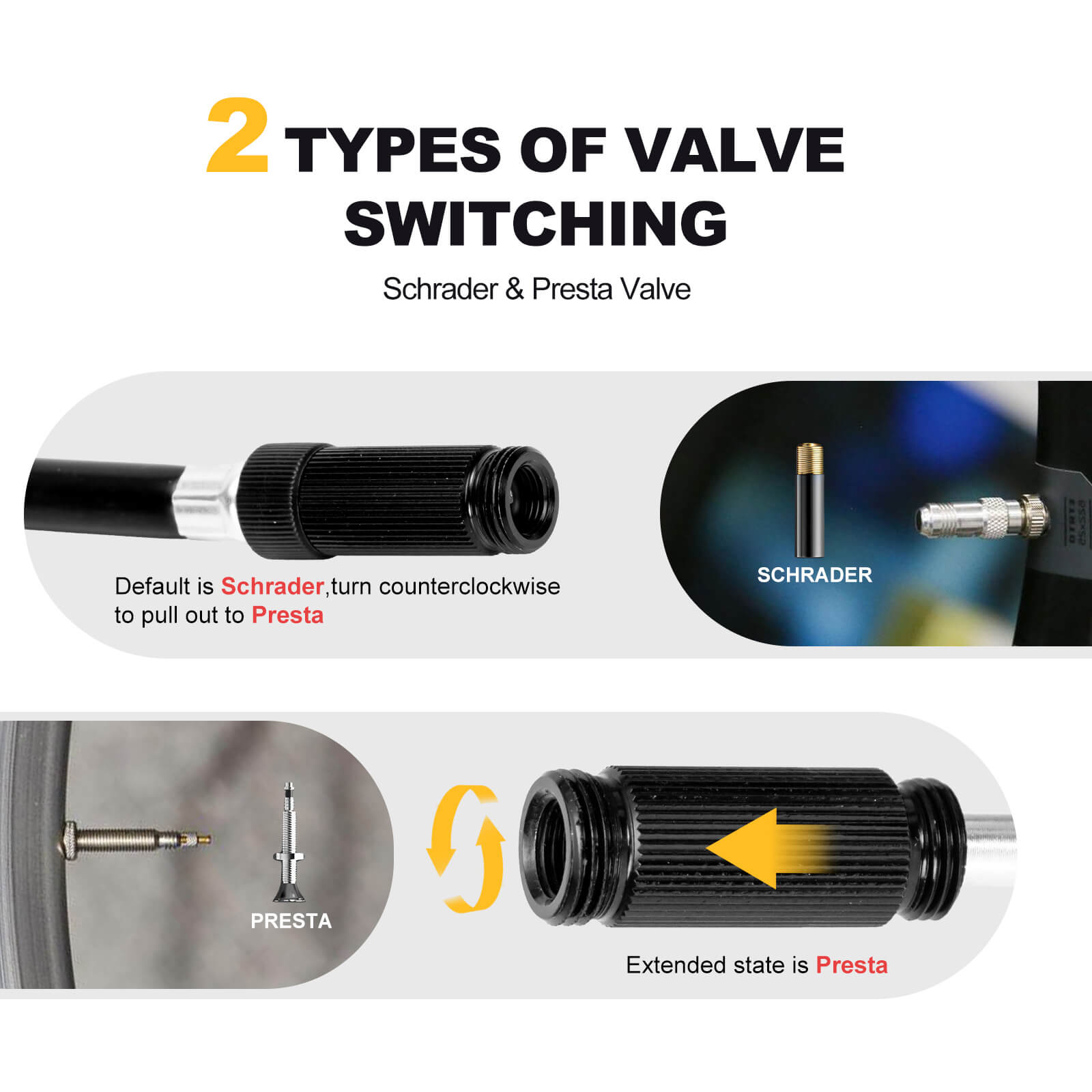 • Smart Valve Design: Compatible with Schrader & Presta valves, ensuring a secure, leak-free seal.