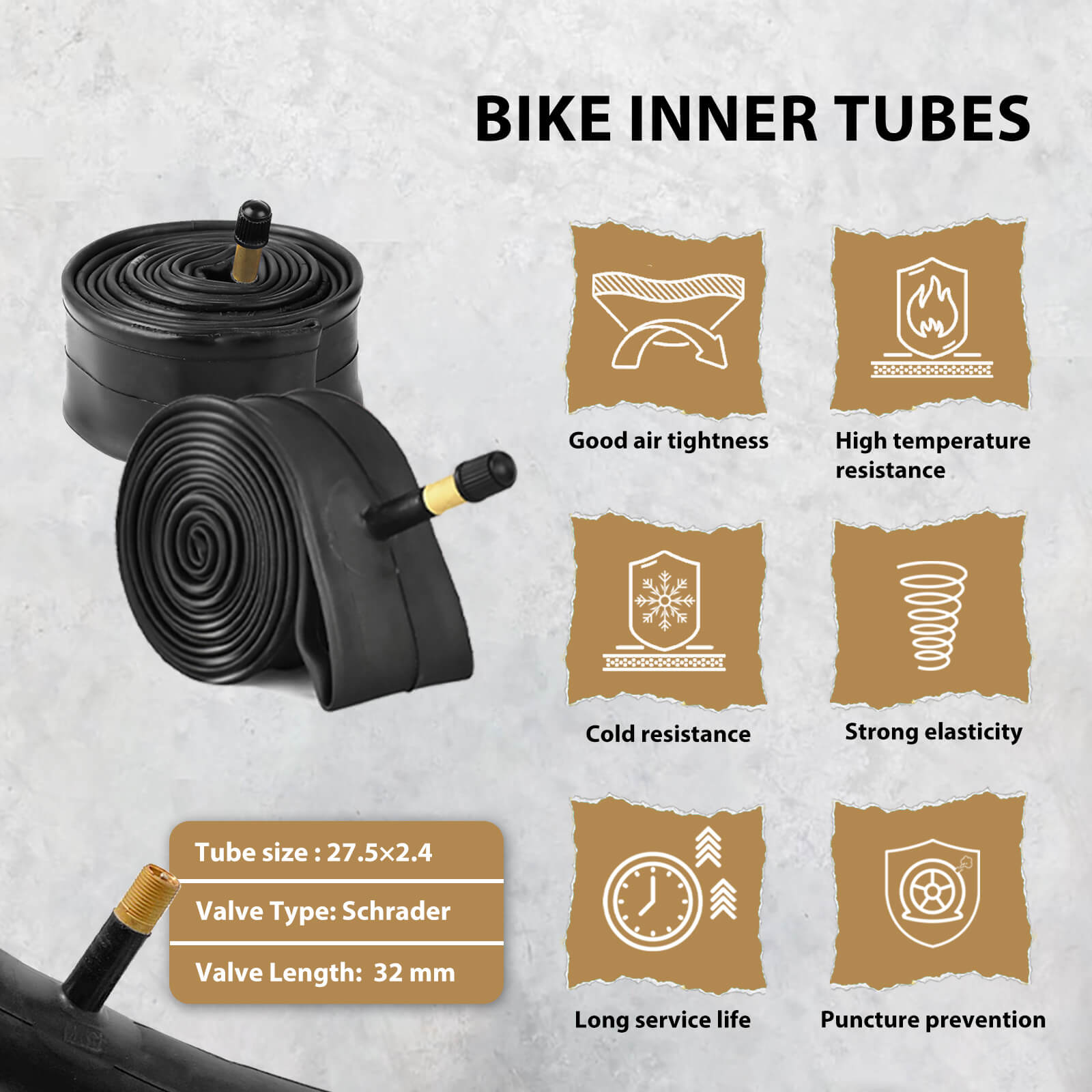 These 2 bike tubes for our e-bikes work perfectly fine and much less expensive than the brand name inner tubes. They fit perfectly, the rubber is good quality and the valve seems to be well made. The air pressure has stayed consistent so far. The tool that is included helped with the installation of the tube. I would recommend!