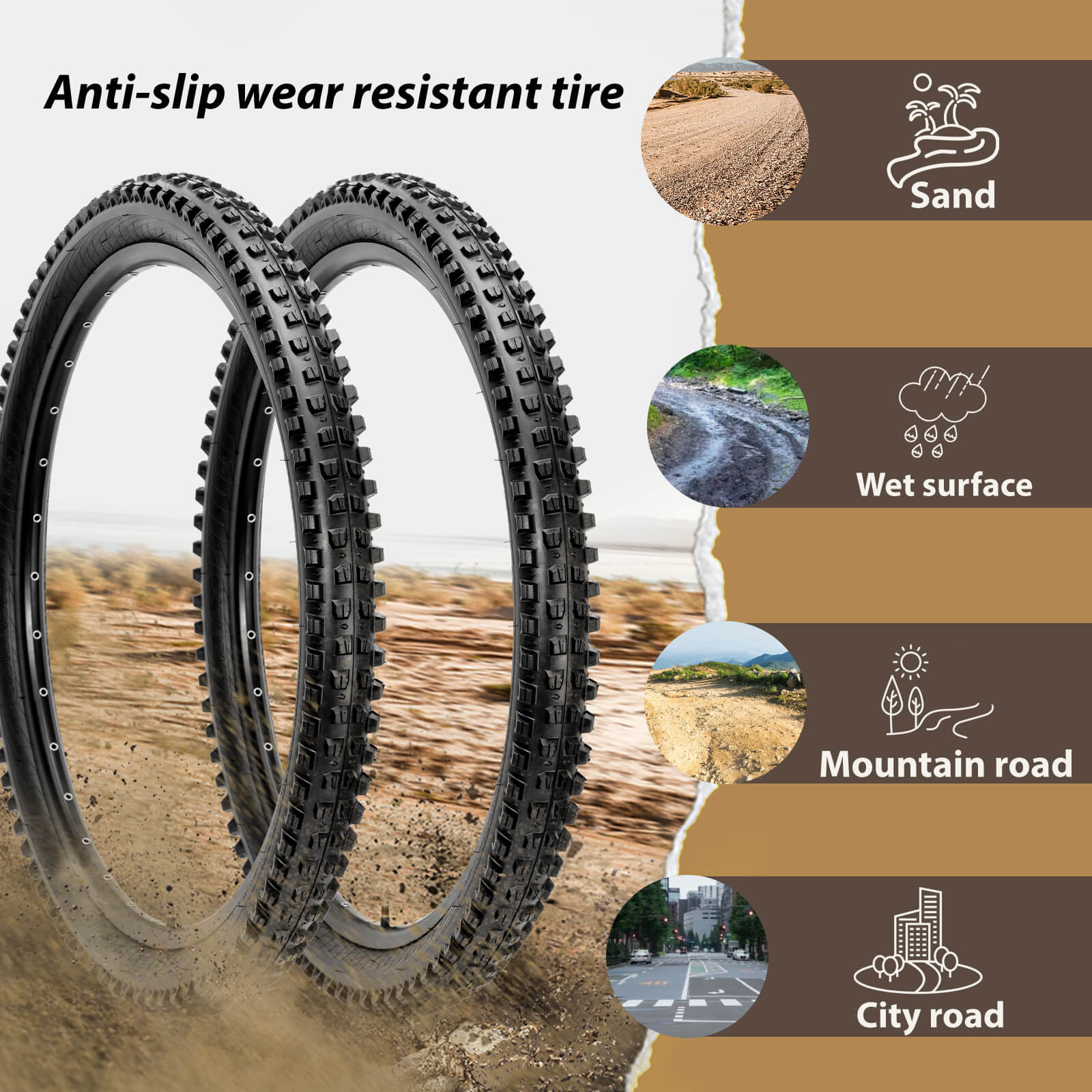 These 29" aggressive tread mountain bike tires are a great product especially for the price. They mounted easily and look great. I especially like that the are all black with not white lettering. Makes a clean look on your bike. Tread is aggressive and great for mud and snow. They are not rated as tubeless, but I've been running them that way for over a month of several trail rides without a problem. They are holding air with tubeless sealant. Great inexpensive tires for winter riding.