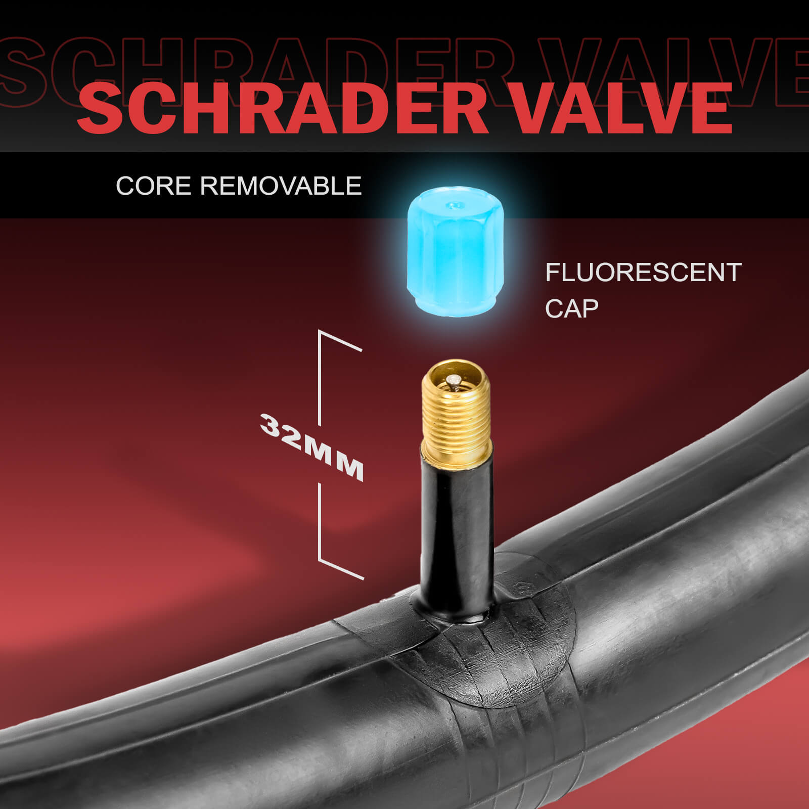 Fits 14” to 29"×1.75"-2.125" tires. With standard American 32mm Schrader valve (AV) works with most kids’ bikes, BMX, mountain, and road bikes.