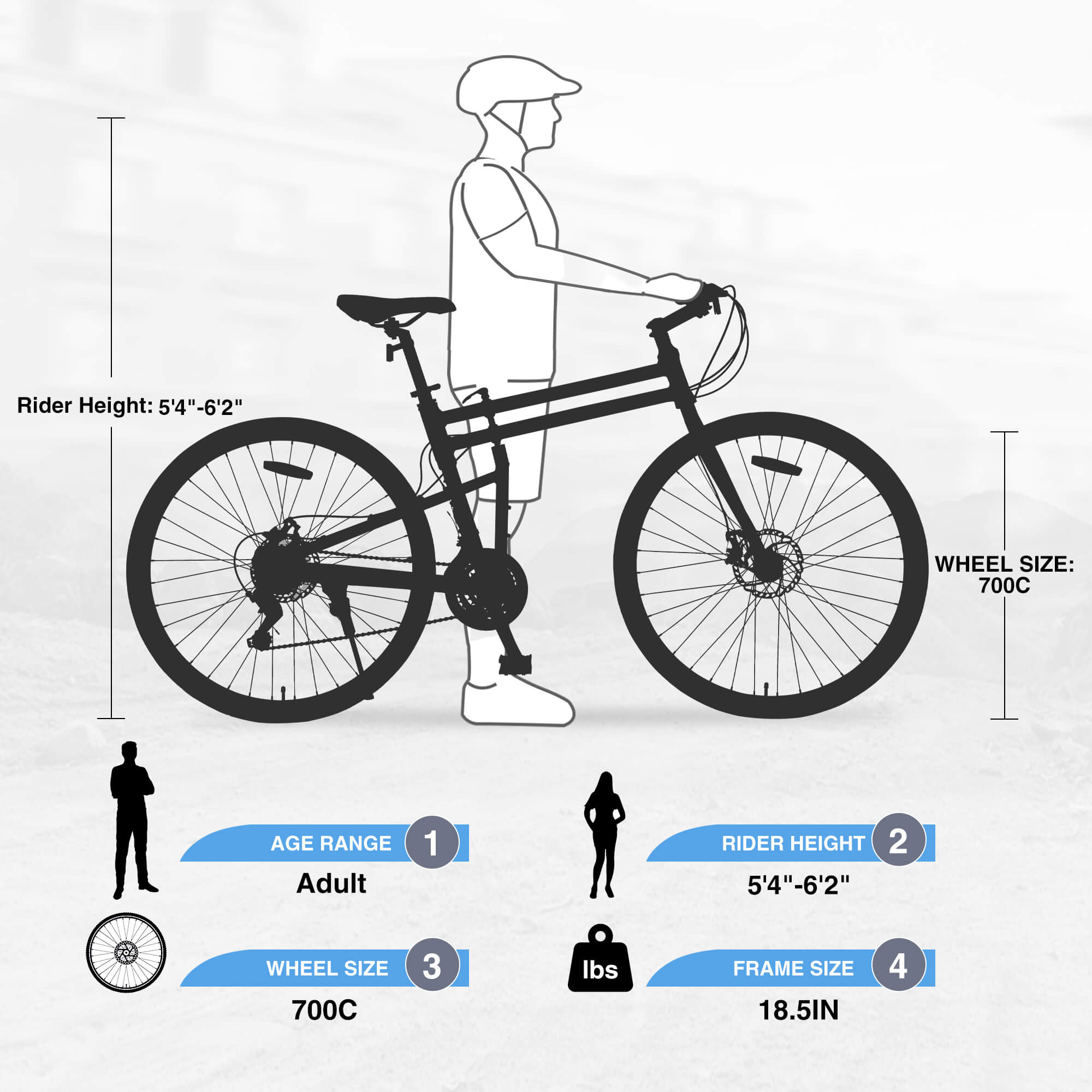 • Bike Size: 700C road bike frame size is 18.5 inches. The height suitable for people is 5'4"-6'2".Max load weight is up to 220 lbs.
